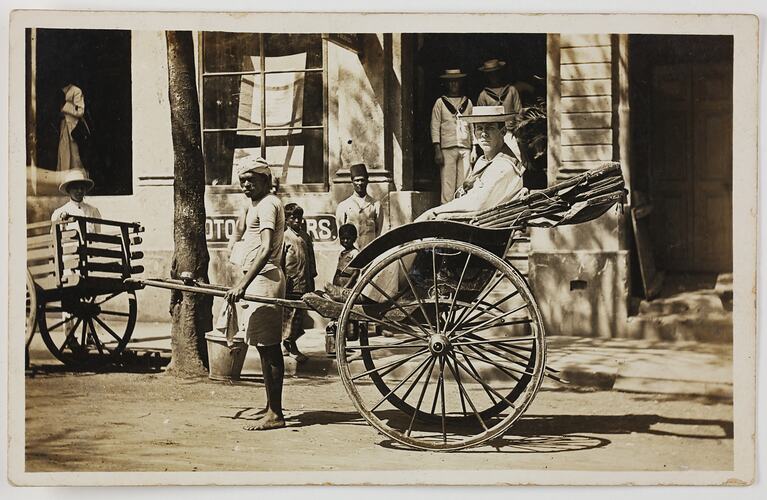 'George' sitting in a rickshaw that is being pulled by a local in Colombo during World War I.