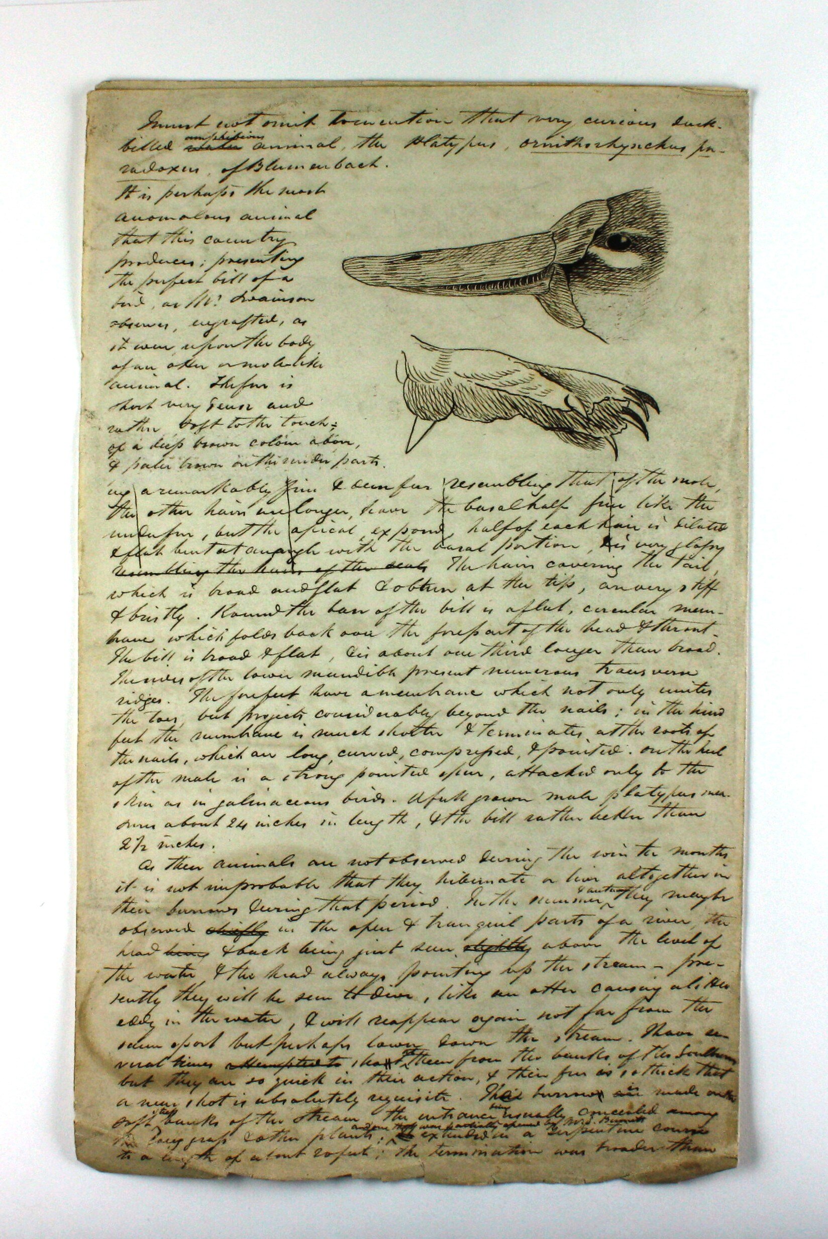 Letter on single sheet of paper folded into four, written (presumably) by ornithologist John Cotton to his brother circa 1834-1848. It begins ' The principle peculiarity in Australian Zoology is the total absence of large quadrupeds, and the paucity of the smaller birds...' The inside folds contain two sketches of mammals, described as a flying 'opossum' and a rat; the back illustrates the beak and foot of a 'very curious duck'. The letter includes descriptions of native animals eaten by local Aborigines.