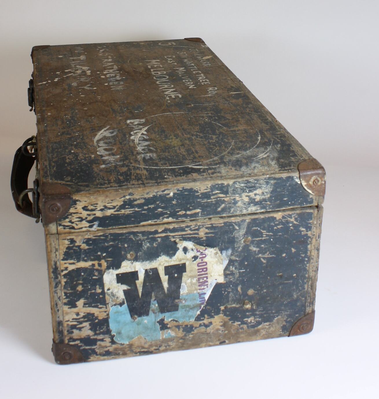 Hand-written in white paint on lid: '5/ J.WARD/371 WATTLETREE ROAD RD/ EAST MALVERN/MELBOURNE/S.S. STRATHEDEN/VIA TILBURY /BAGGAGE ROOM'. Hand-written in white paint on left side: 'W'. Sticker on right side: 'W/P&O Orient Line'