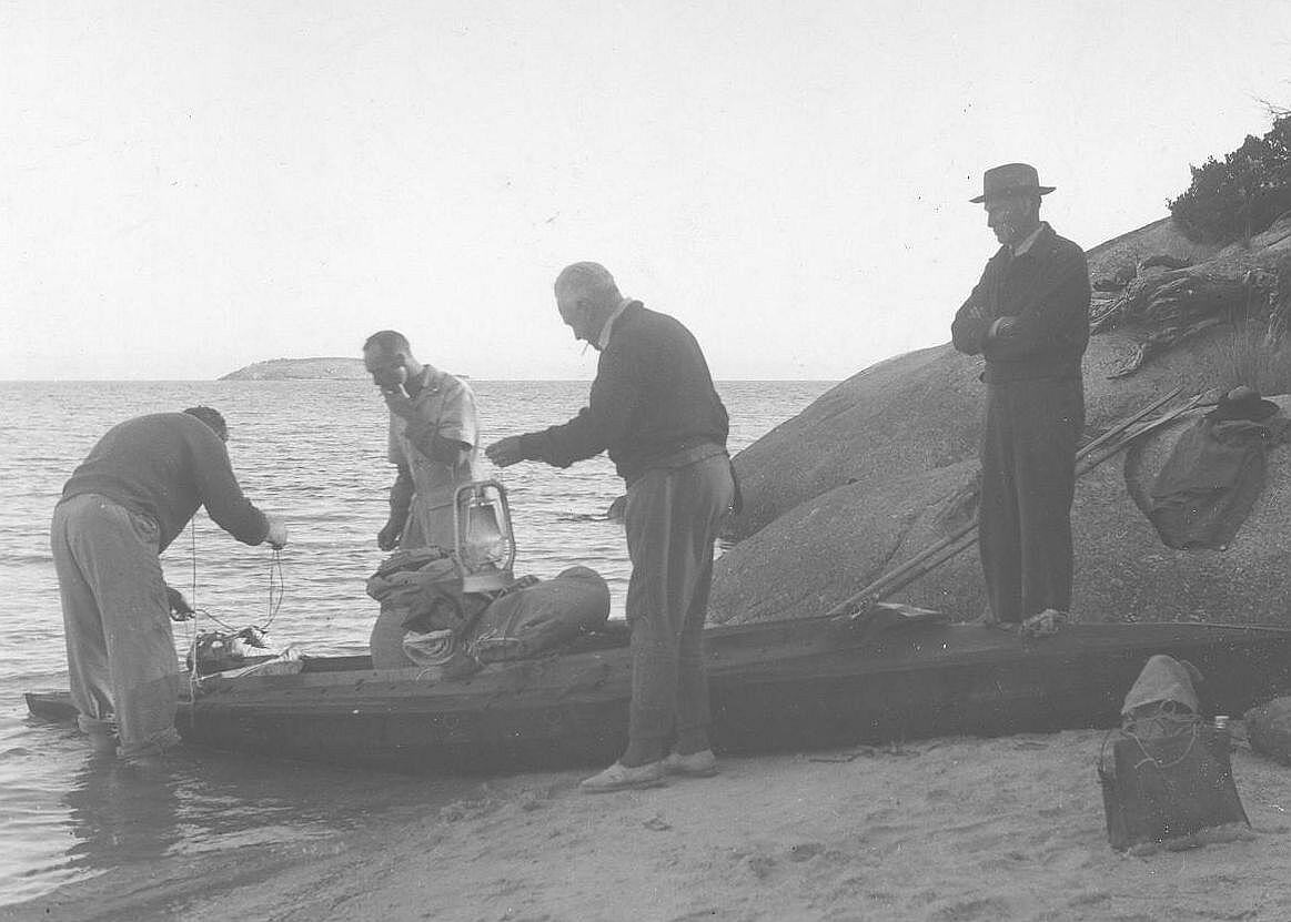 Black and white image of the National Museum survey team packing a canoe in preparation for excursion to Corner Inlet during the Museum's Wilson's Promontory expedition in January 1950. Pictured from left is Dermot Casey, Warren Hiscock, Charles Brazenor and Ruben Paton. It can be assumed that the only member of the survey team not pictured, Hope Macpherson, took this photograph. Hope Macpherson was the first female curator at National Museum of Victoria (now Museums Victoria).