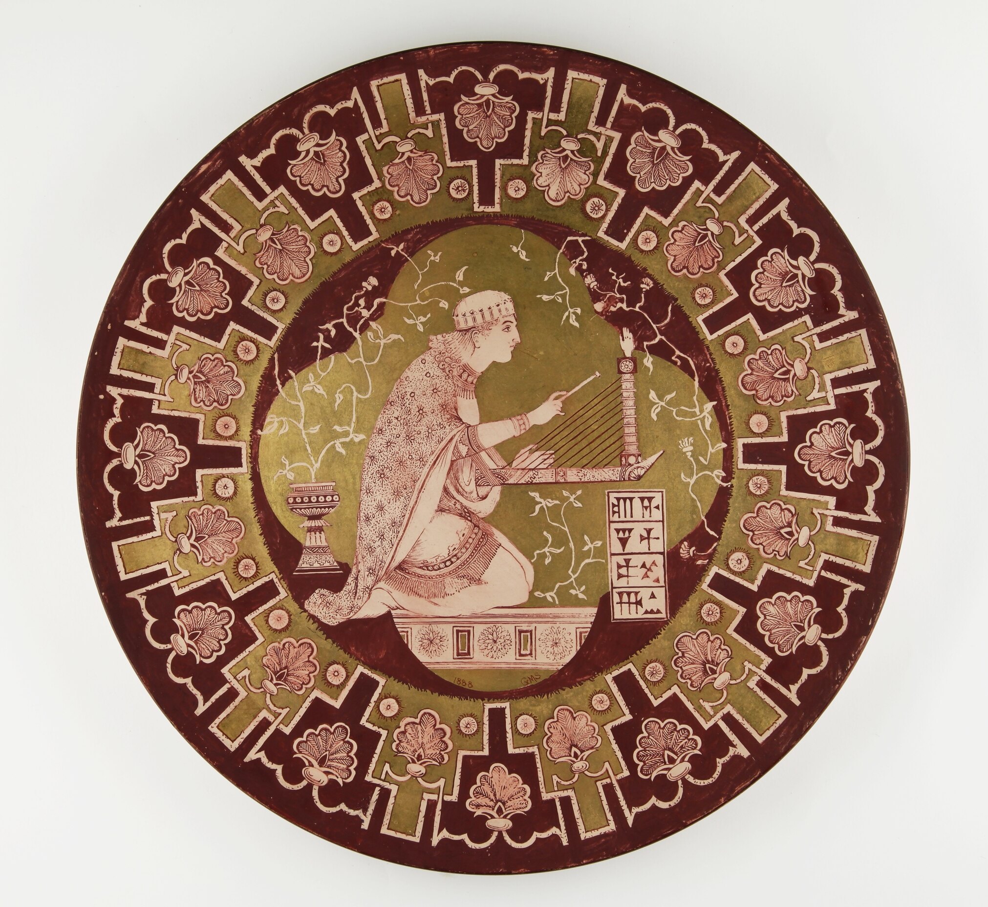 Ceramic wall-plate decorated in the late-nineteenth century Aesthetic style with obvious Sumerian decorative motifs, signed 'GMS' and dated 1888 within the design.