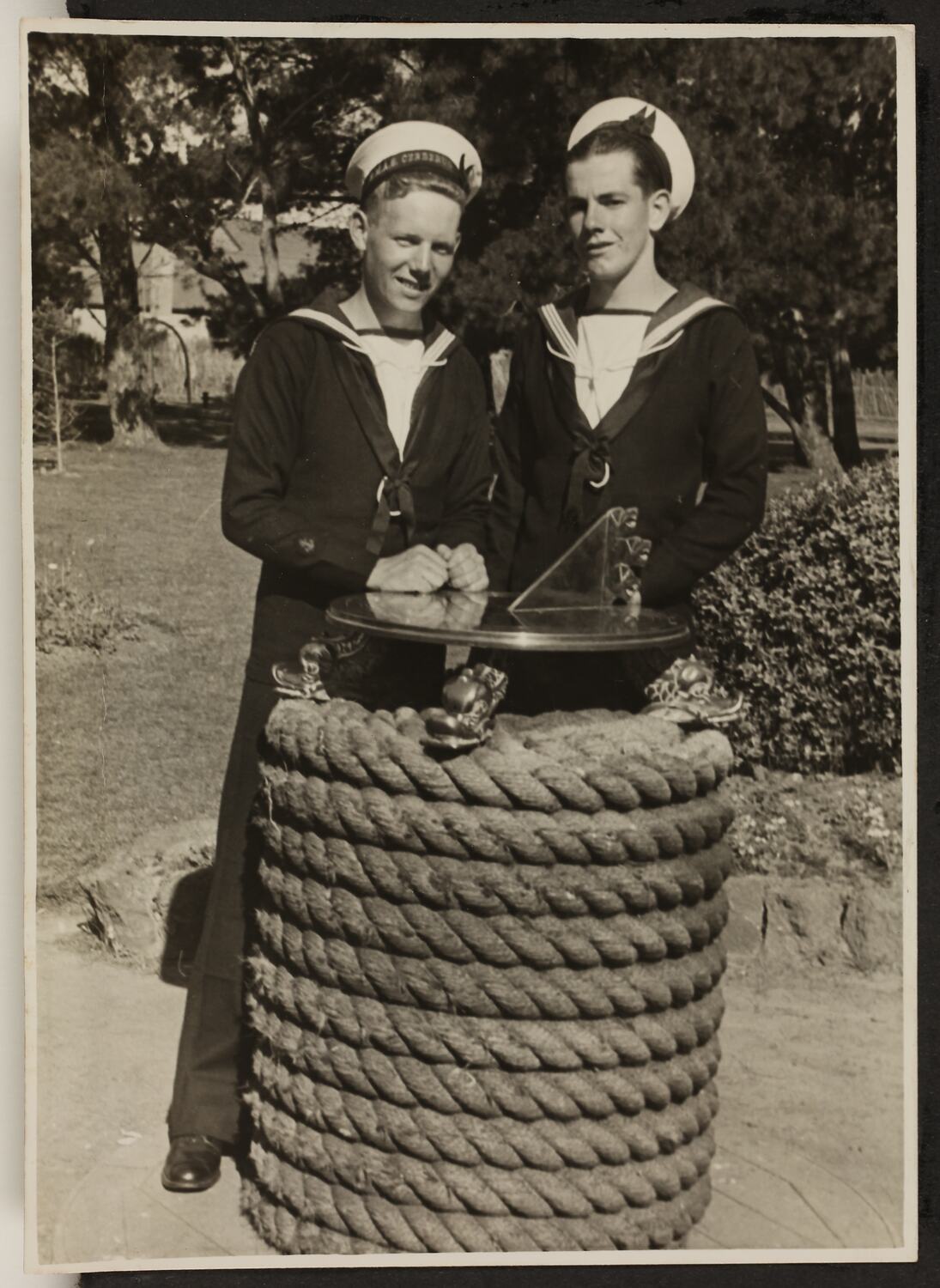 A photograph of two seamen standing behind a sundial during World War II. One of two photographs mounted to a black board. One of 32 black and white photographs, some in the form of postcards, relating to the military service of David Ralph Goodwin, Ex H.M.A.S. Association (Vic).