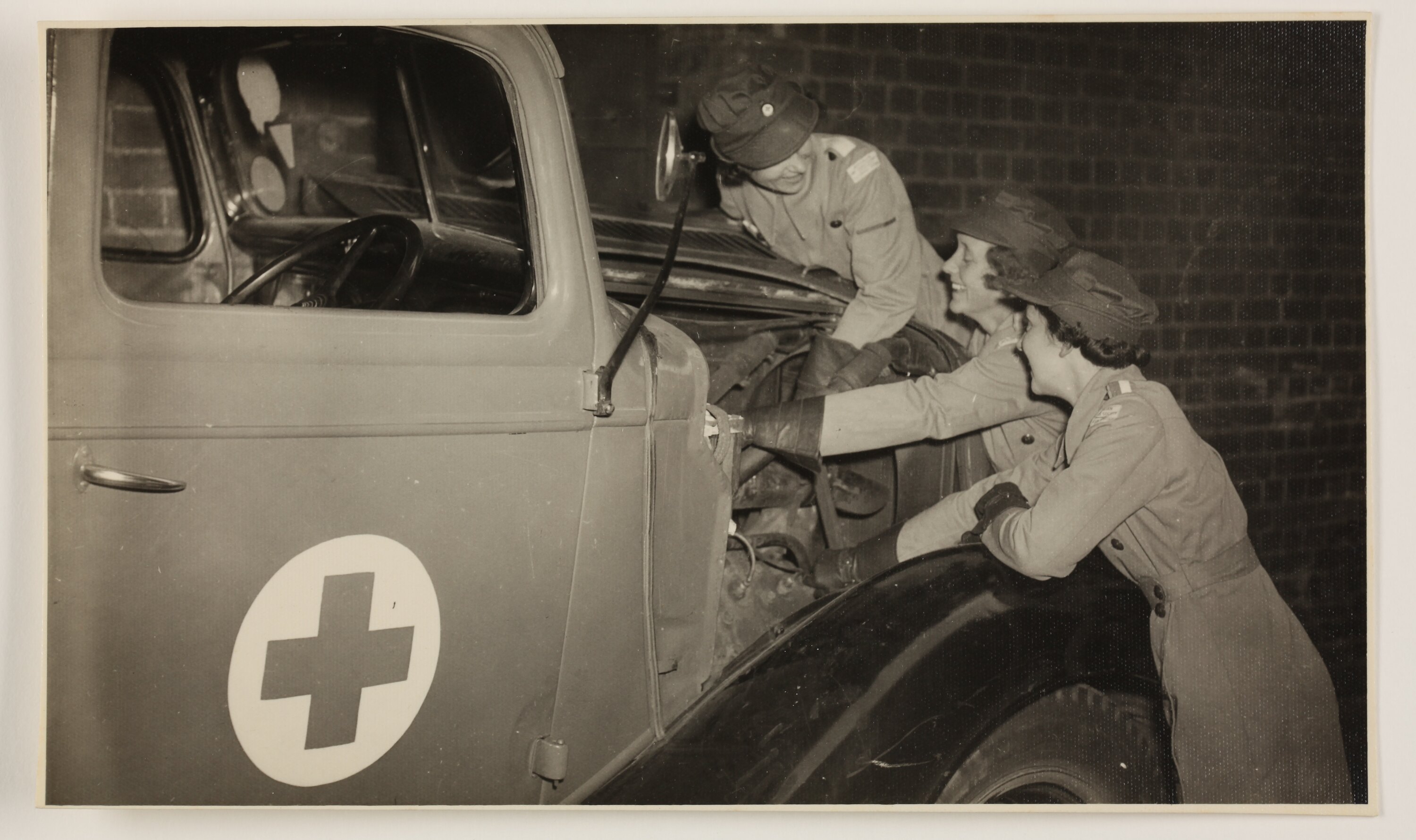 Portrait of three women looking into a Red Cross transport vehicle during World War II. One of three black and white photographs relating to voluntary activities in Melbourne during. World War II