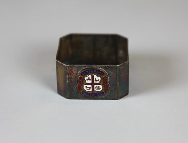 Silver plated napkin ring produced as a souvenir of the centenary of Melbourne in 1934. The napkin ring features an enamelled shield bearing Melbourne's Coat-of-Arms.