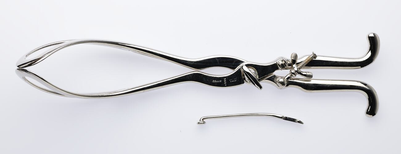 One part from a set of chrome-plated childbirthing forceps, which belonged to Dr Constantine Kyriazopoulos, medical practitioner in Melbourne, 1900s-1930s. The instrument has been re-chromed as part of essential conservation treatment due to their extremely rusted condition when acquired by the Museum.