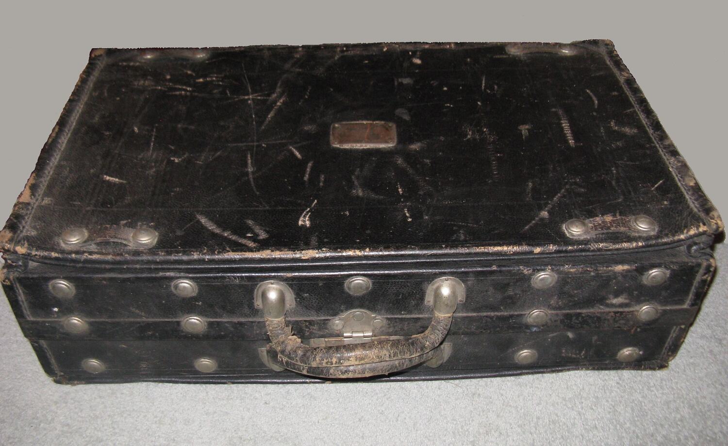 Black leather case with two rounded black leather handles and a series of round silver metal screws around entire side of case. Case secured by silver metal plate with a click lock and hole for key. Top and bottom of case are expandable to increase storage space. Top of case has silver metal plaque with owner's detailed inscribed. Interior of case lined with cream fabric and there are two straps and two matching buckled straps hanging from lid.