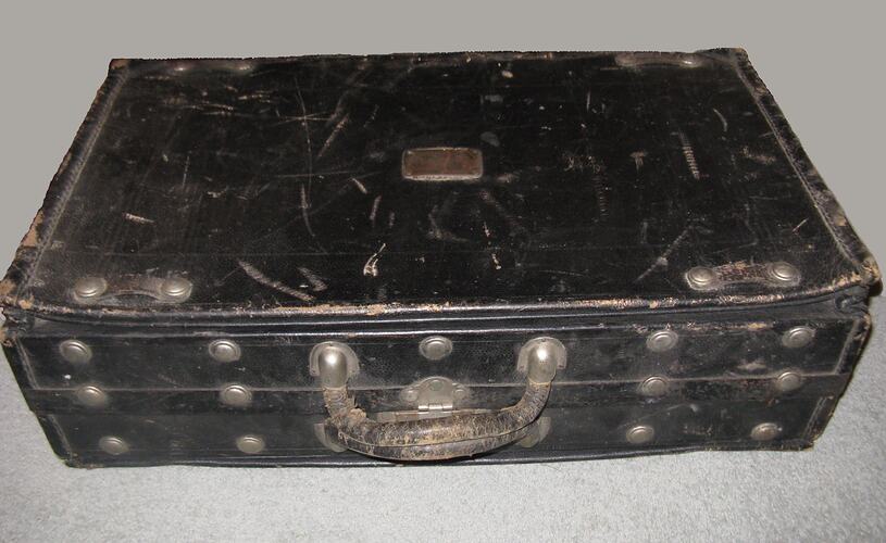 Black leather medical travel case which belonged to Dr Constantine Kyriazopoulos for his medical practice in Melbourne. The case has an engraved plaque giving his address at 168 Victoria Street North Mellbourne, his first business location before moving to 71 Collins Street in the city. It is likely Constantine continued to use this case until his death in 1939.