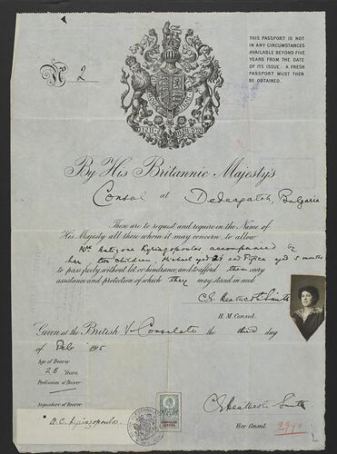 Passport issued by the British Consulate in Bulgaria to Antigoni Kyriazopoulos on 3 February, 1915.