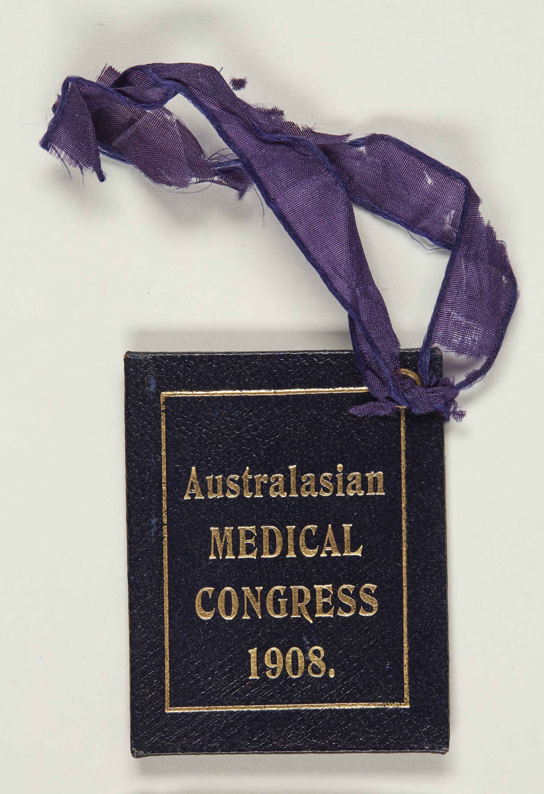 Front: Australasian/MEDICAL/CONGRESS/1908 Reverse: Melbourne 1908/ Issued To/ [handwritten] Dr C.M. Kyriazopoulos/H.C. MAUDSLEY/Gen. Sec.