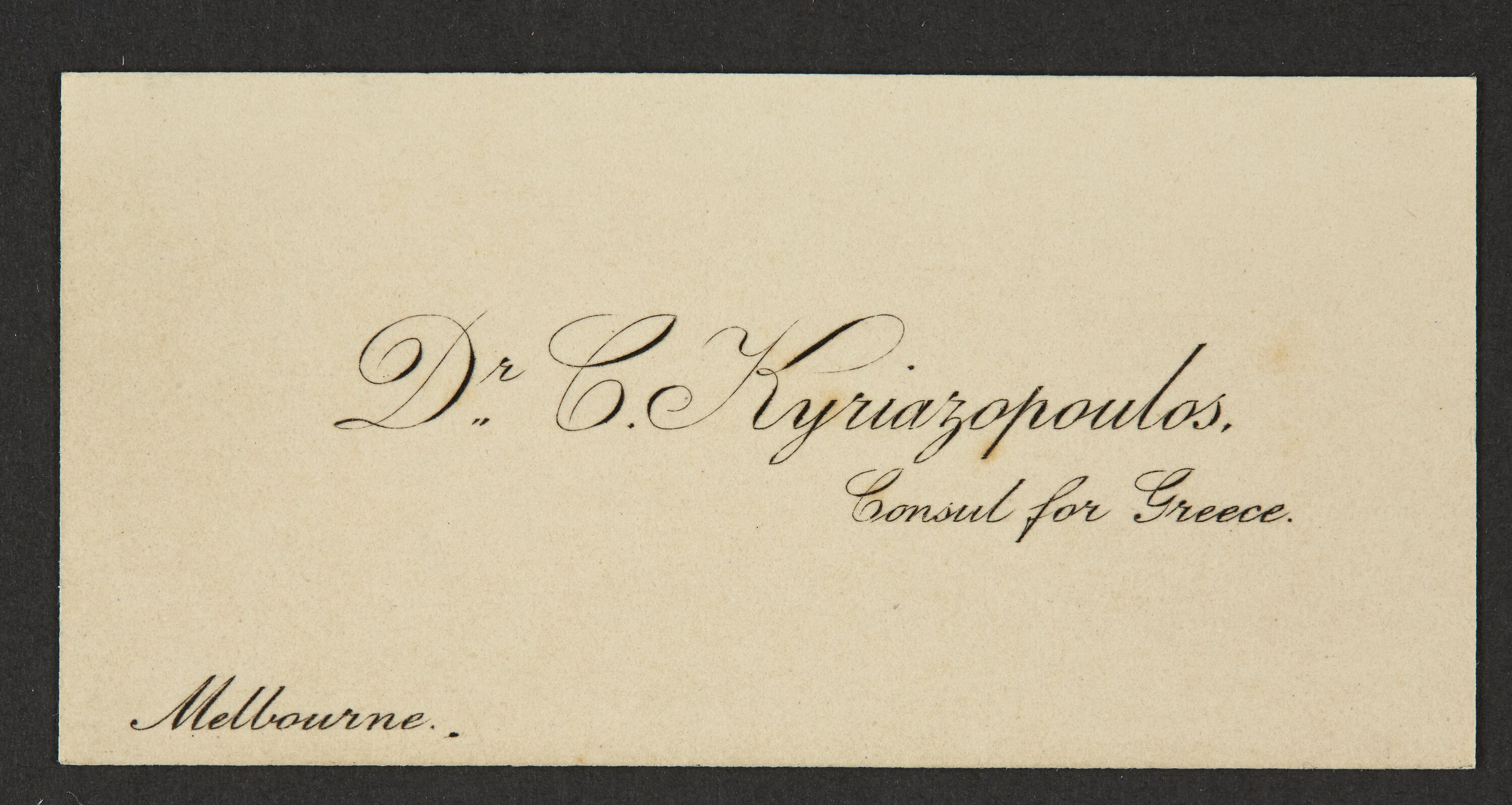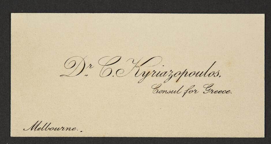 Business card for Dr. C. Kyriazopoulos, Consul for Greece in Melbourne, a position he held from 1921 to 1923.
