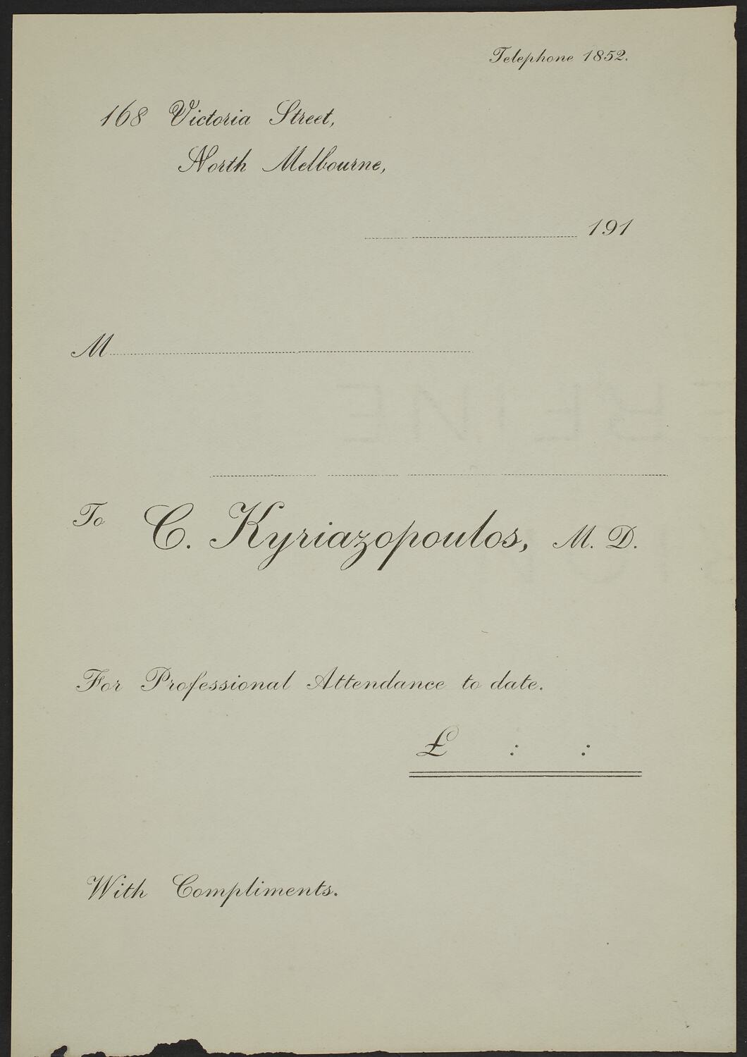 Uncompleted invoice used by Dr Constantine Kyriazopoulos as part of his medical practice in Melbourne, 1910s. The address at the top of the invoice, 168 Victoria Street North Melbourne, was his first private and business address. He subsequently relocated his medical practice to 71 Collins Street in the city where he remained until his death in 1939. Constantine uses his full name Kyriazopoulos; later documents reveal his name change to Krizos in 1926.