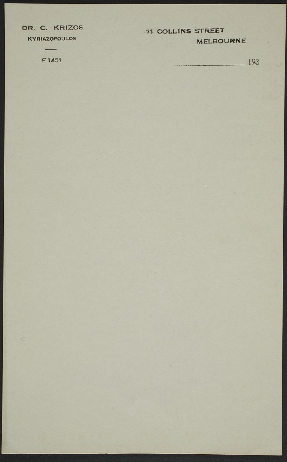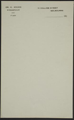 Sheet of notepaper with letterhead used by Dr Constantine Kyriazopoulos at his second and final business address at 71 Collins Street, Melbourne. The letterhead signals Constantine's name change to Krizos in 1926.