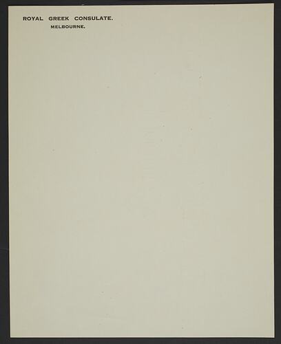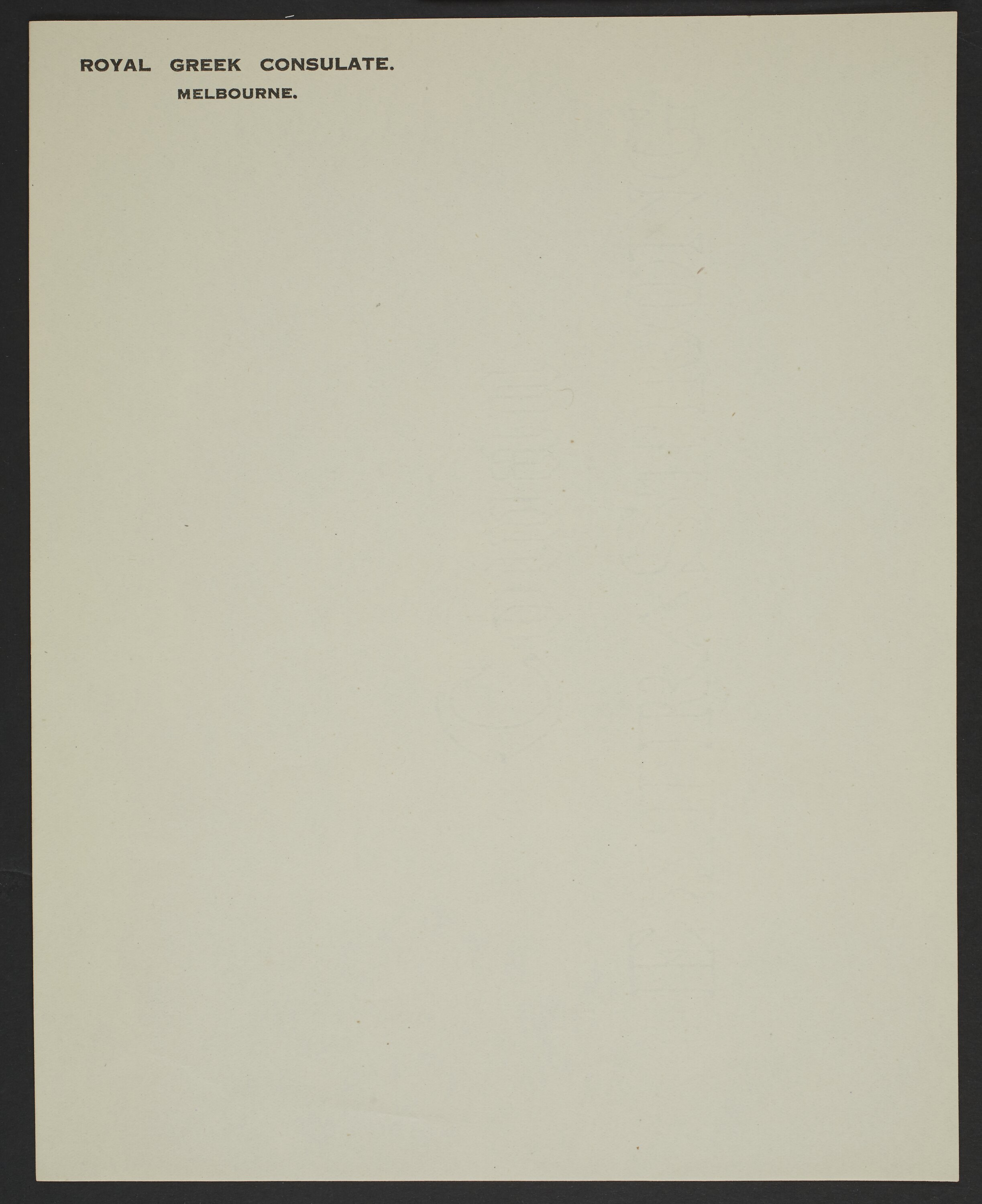 Letterhead used by Dr Constantine Kyriazopoulos when he was appointed as Honorary Consul for Greece for Melbourne from 1921 to 1923. The collection also holds his uniform (HT30950) and photograph of Constantine wearing the uniform (MM 127456).
