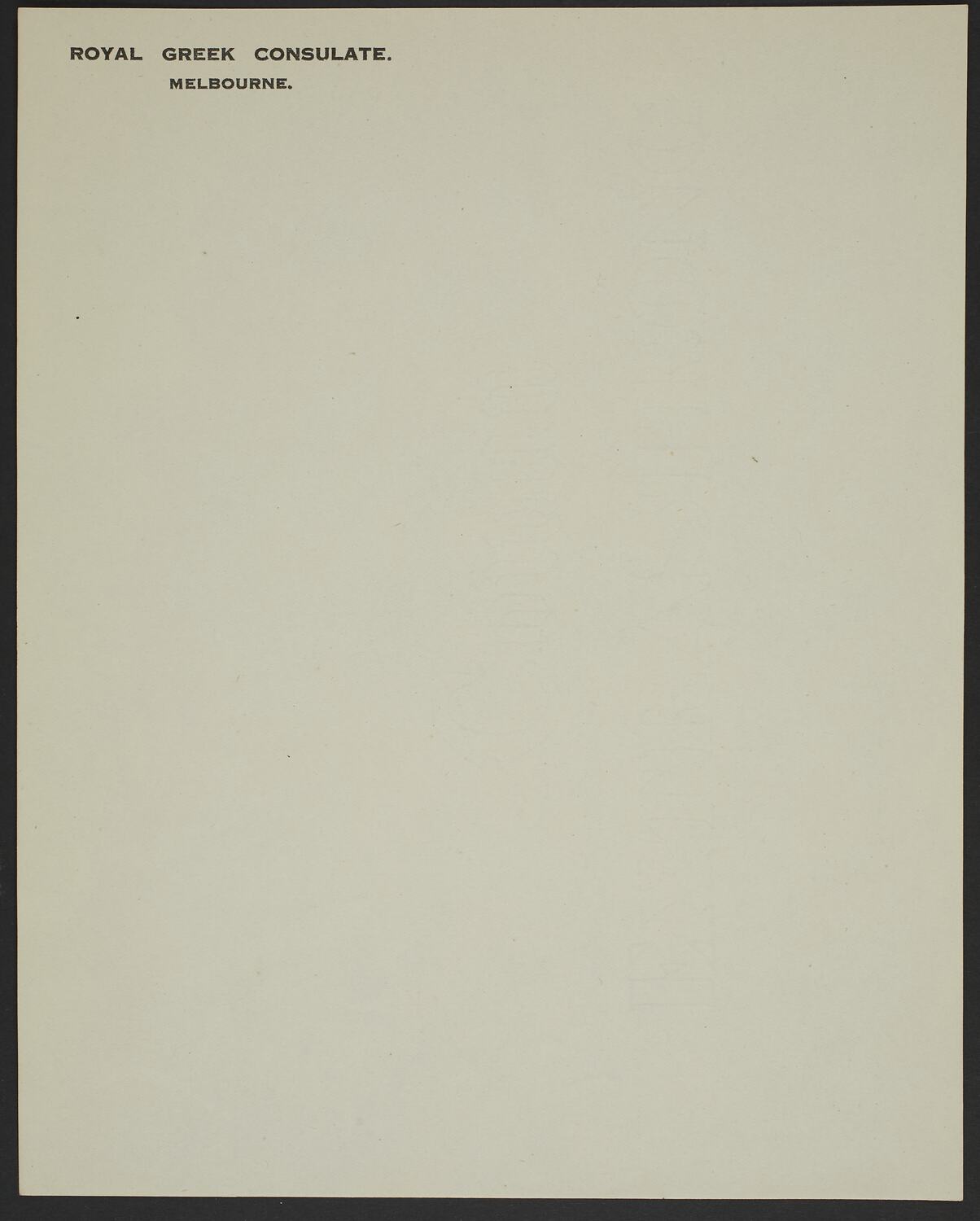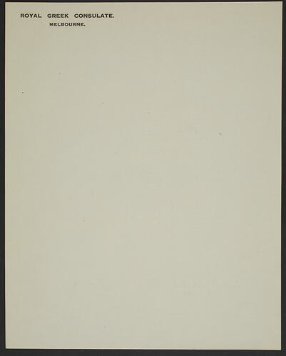 Letterhead used by Dr Constantine Kyriazopoulos when he was appointed as Honorary Consul for Greece for Melbourne from 1921 to 1923. The collection also holds his uniform (HT30950) and photograph of Constantine wearing the uniform (MM 127456).