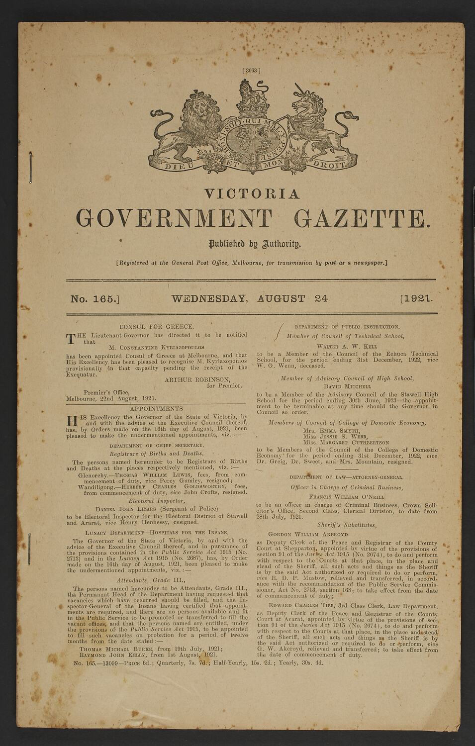Victorian Government Gazette, published 24 August 1921. A notice on the front page announces the appointment of Dr Constantine Kyriazopoulos as Consul of Greece in Melbourne on 22 August, 1921.