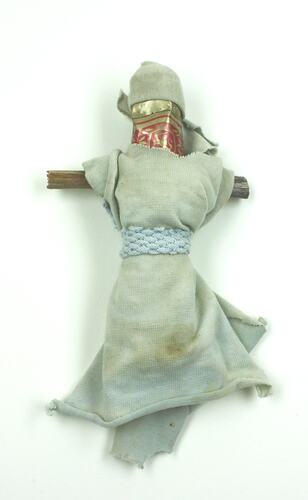 Human figure with a cigar box torso, stick for arms and cloth fragments on body (held with strip of fabric at waist) and head (tied at back). The dress has a brown stain at lower front.