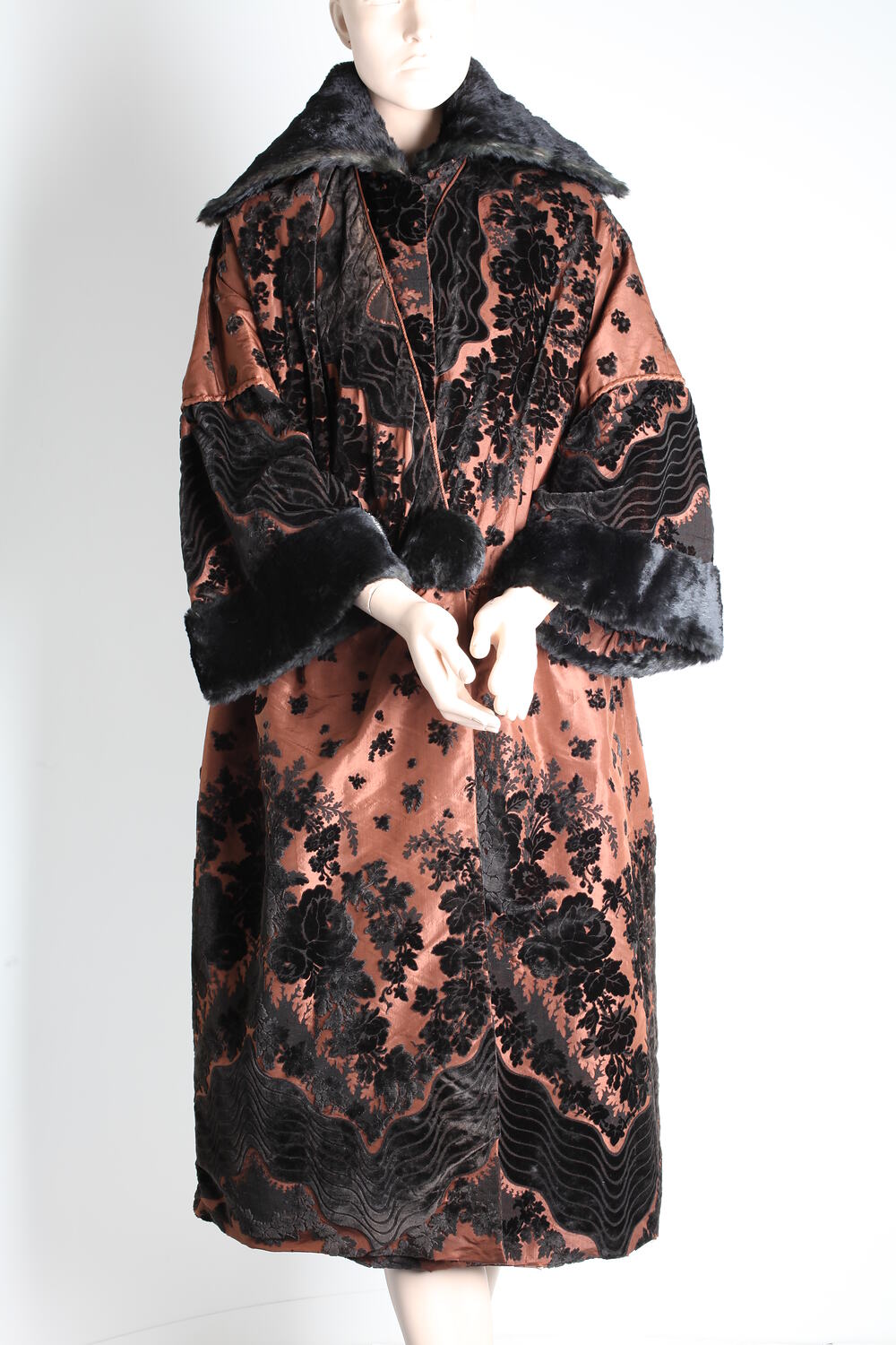 Brown raw silk coat with fluted ridging around waist. Coat has large black fur collar and broad black fur sleeve cuffs. Entire coat decorated with black velvet floral elements and wavy zig zag patterning along bottom of coat and above the sleeves. One large round black fur-covered button attached at front of right lapel and a hook for the hook and eye fastening is sewn at the waistline. A hook and eye also at neck of collar. The coat is lined with cream fabric and features a small inner pocket at inside left waist line and decorative scalloped stitching edges the pocket and the lower lining edges. There is no maker's label.