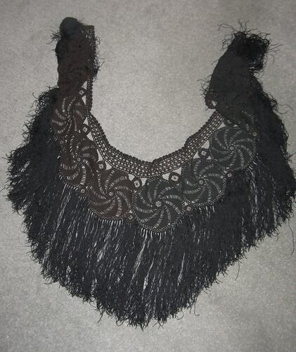 Black fringed shawl, worn by Antigoni Kyriazopoulos in Melbourne, circa 1920s. Antigoni Dimissa migrated to Australia from Greece in 1909 to marry Constantine Kyriazopoulos, a doctor who had arrived in Melbourne in 1902. They were from a similar part of Greece and knew each other before migrating. Antigoni, a well-educated woman, became active in Melbourne's cultural, social and fund-raising life.