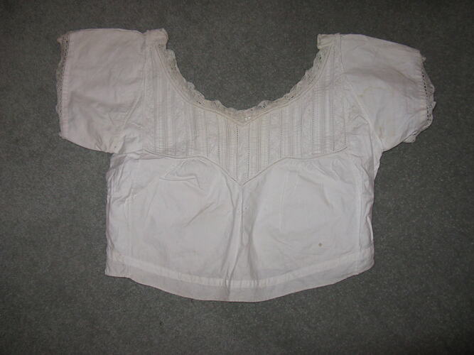 White cotton camisole with short sleeves and neckline edged with lace. Fine white pleating and floral embroidery work across front of bodice. Bottom edge double hemmed. The initials 'AD' embroidered at centre front of garment.