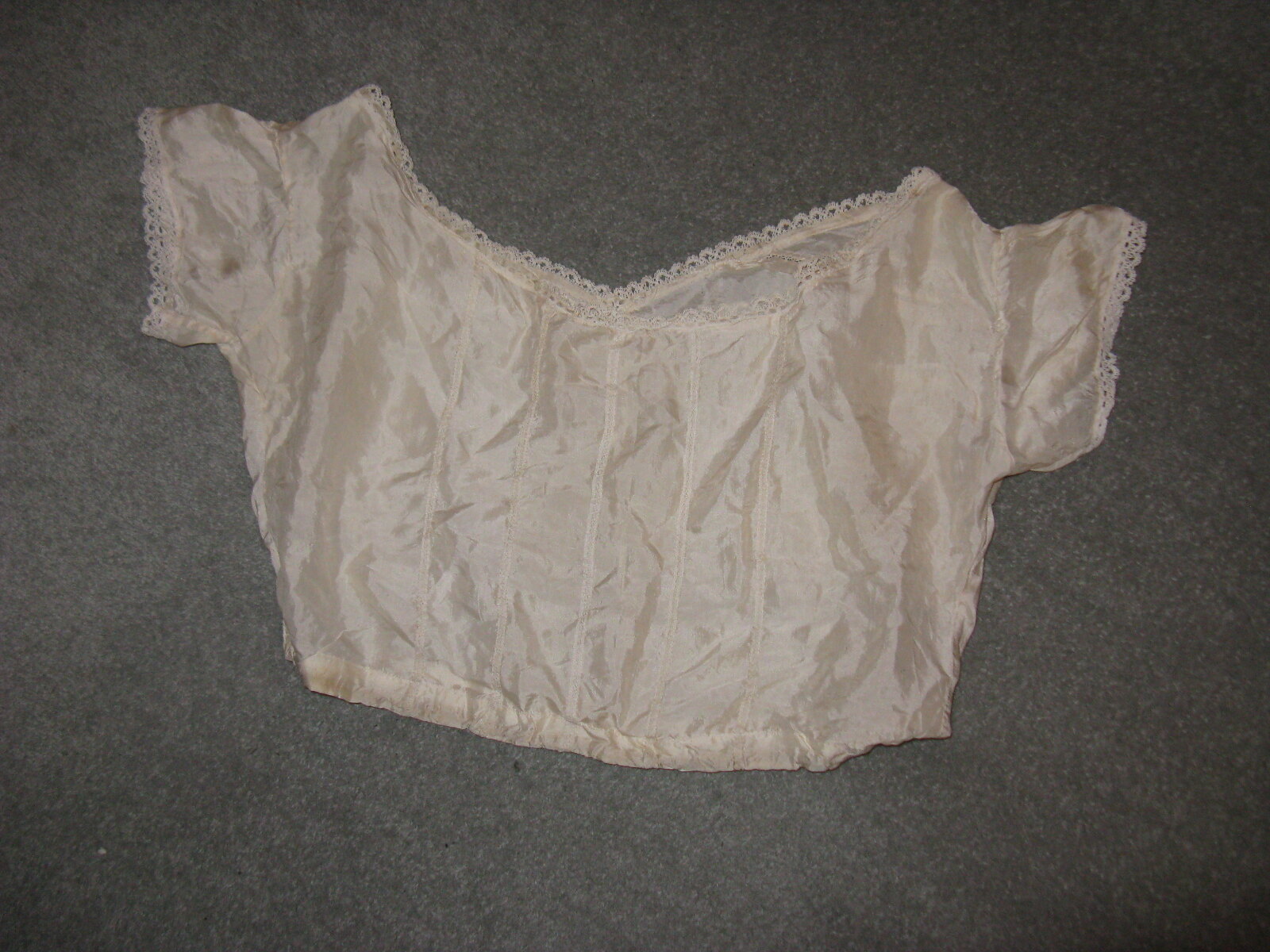 Fine cream silk camisole, short sleeves with lace edging sleeves and wide neckline. Five lines of vertical lace sewn across front of bodice and one line down centre of back. Elasticised around waist.