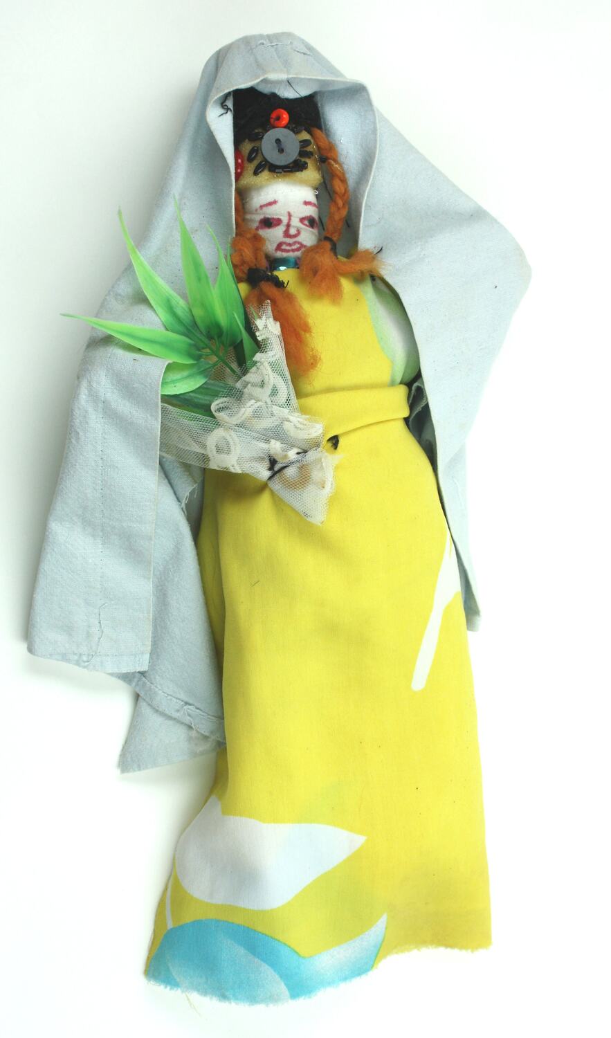 Female figure made from found materials, including cloth, wood, buttons, beads and plastic foliage. Her face is drawn on in red and black on white fabric. She wears a long yellow dress, has a large scarf over her head which extends to her 'knees' and has an elaborate hairstyle with buttons and long red textile plaits. She carries a spray of plastic foliage wrapped in synthetic lace.