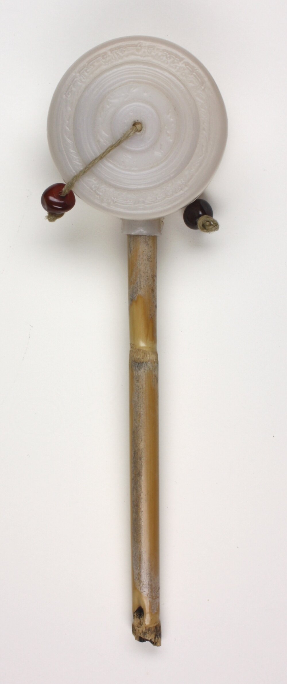 Baby rattle constructed from a plastic flask mounted on a bamboo handle. The flash is threaded with string, onto which are threaded two red beads.