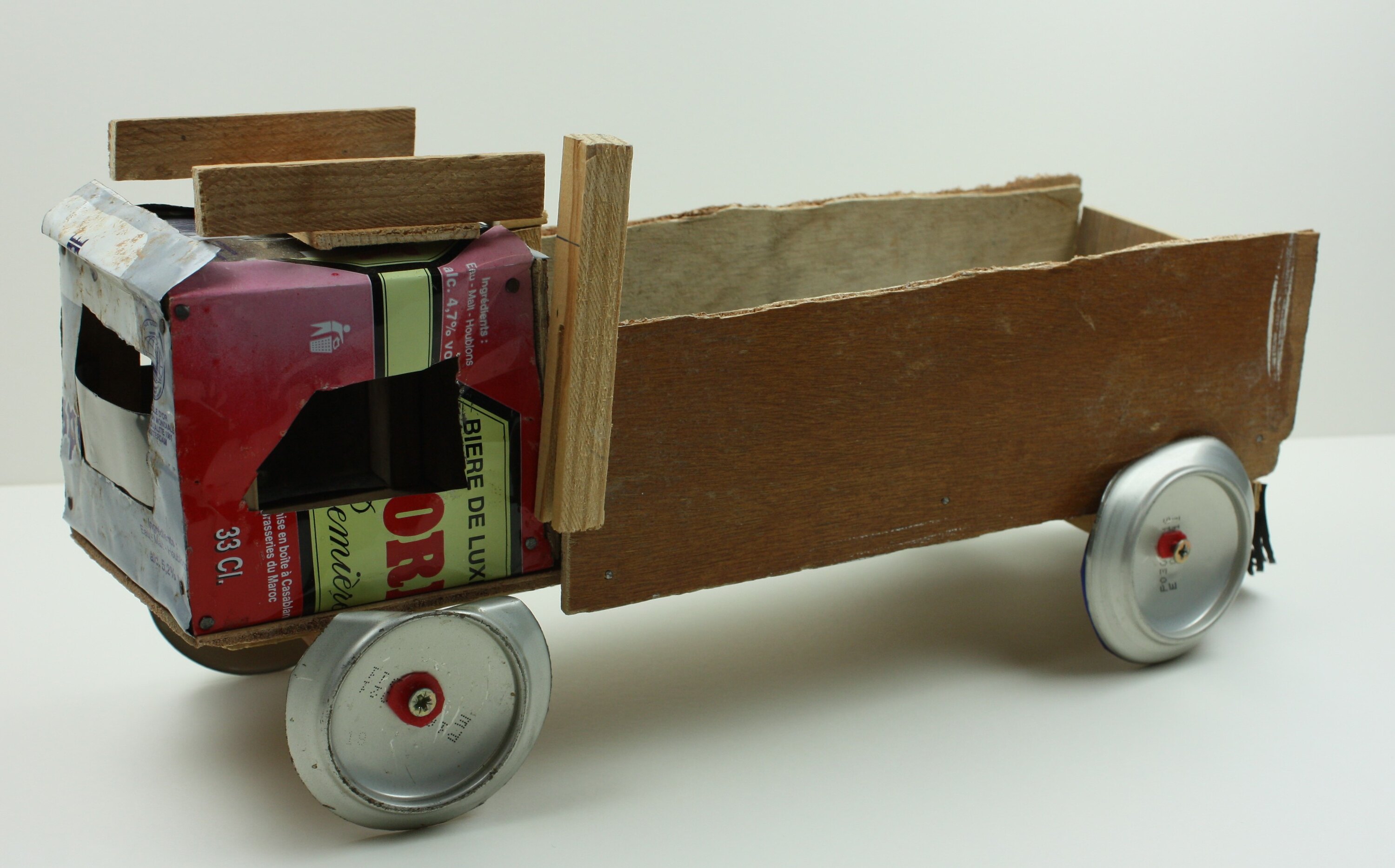 Toy truck, constructed from found material, including scrap wood, cardboard, metal containers, and metal soft drink cans. It was made by an older boy from the Ikenwen village, Tiznit Province, in 2009.