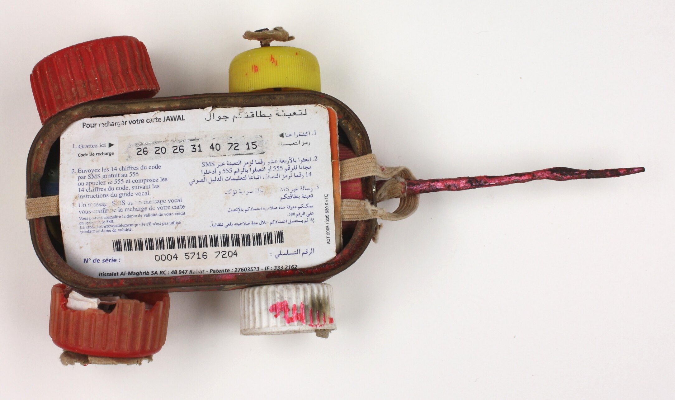 Toy car with body made from a metal sardine can; red, yellow and white plastic bottle lids form the wheels. A metal stick extends from the front for pulling, with off-white cord around. A printed white card with barcode - likely a phone card - has been placed inside the car body; another card is visible beneath.