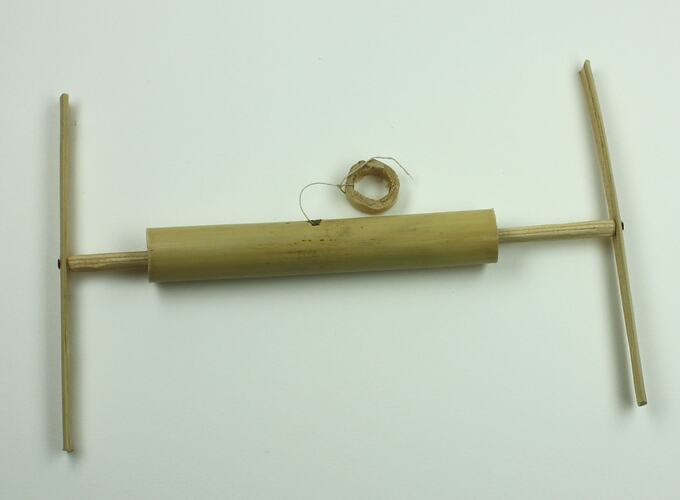 Toy helicopter made from bamboo. A stick extends from each end of its main body, with a cross blade on each end. It is activated by pulling a string with bamboo loop on end to propel the blades.