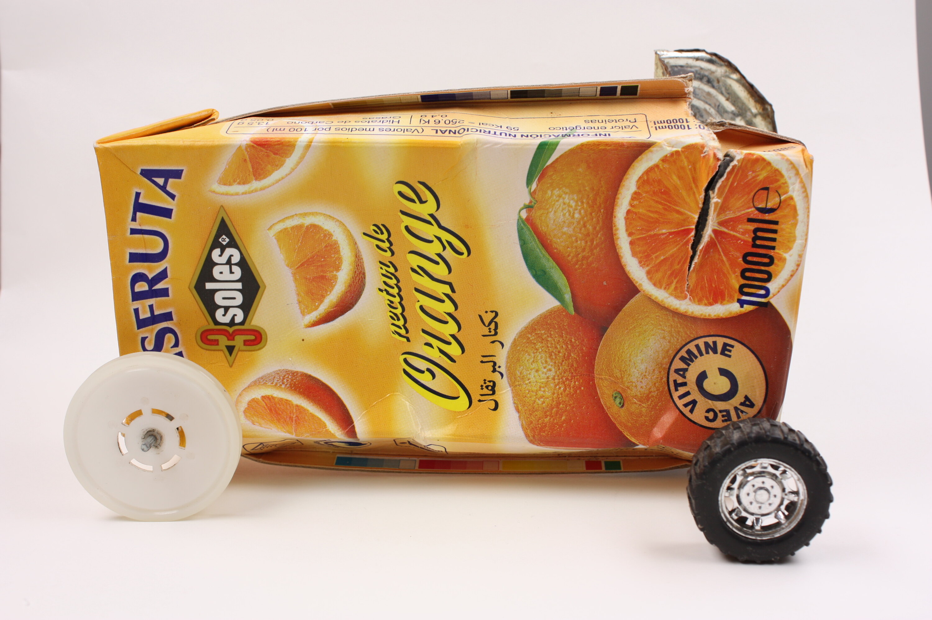 Toy tanker truck comprising a printed cardboard orange juice container, with images of oranges and extensive text; a bent metal can lid inserted in a slot in the side; and black plastic wheels from a commercial toy.