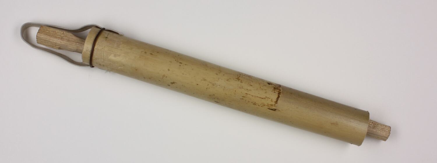 Toy arrow thrower, constructed from a main reed body, within which a smaller stick slides. A loop of elsatic at one end, secured with a metal band, would be used for propelling.