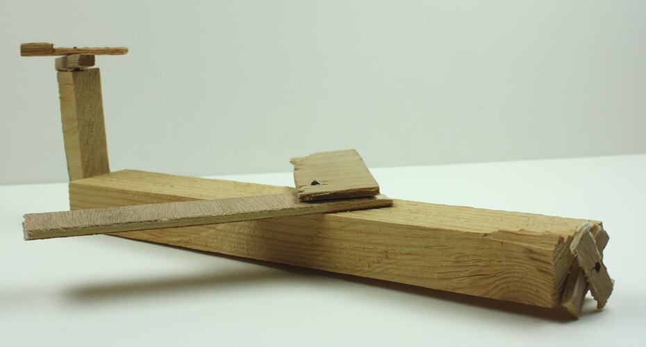 Toy aeroplane, made of offcuts of timber, roughly cut and joined with nails. Comprises main fuselage, pair of wings, propellor on front of fuselage, and elevated tail with propellor.