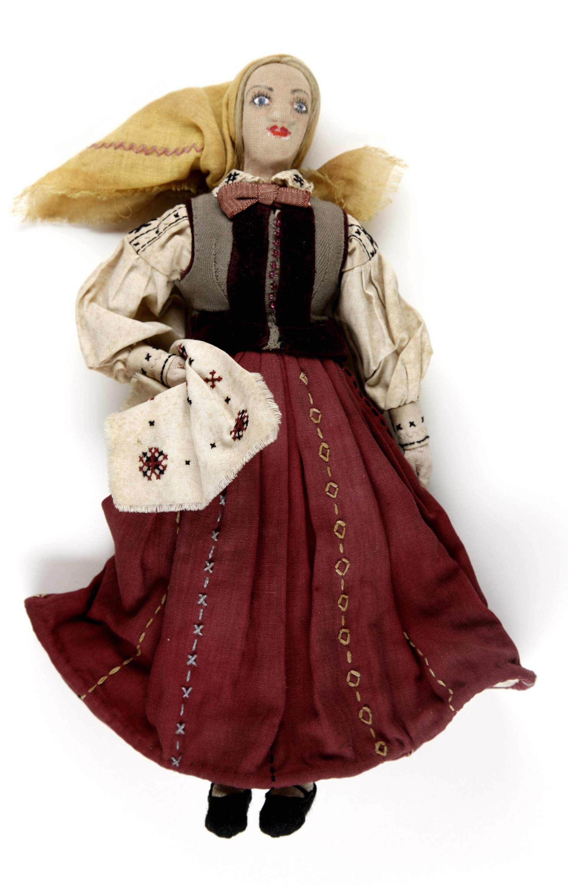 Female doll wearing tradtional folk dress. Doll is wearing cream blouse with black embroidery under a grey waistcoat. She wears a maroon skirt with emboidery over a cream petticoat and undergarments. She is wearing cream socks with coloured thread tied at the knee and black shoes. She carries a handkerchief and wears a yellow headscarf over blonde hair. The doll apears to have been made from plaster head and legs with a stuffed body. The body is made from a stocking-like fabric and facial features have been painted on the face.
