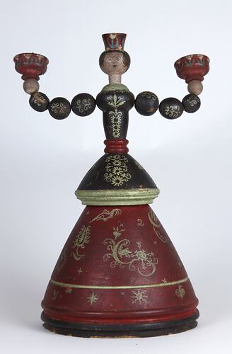 Painted wooden candlestick holder collected by UN World War II displaced persons' camp worker Esma Banner between 1945 and 1951. It was created by a refugee in one of the displaced persons' camps in the US Zone in Germany.