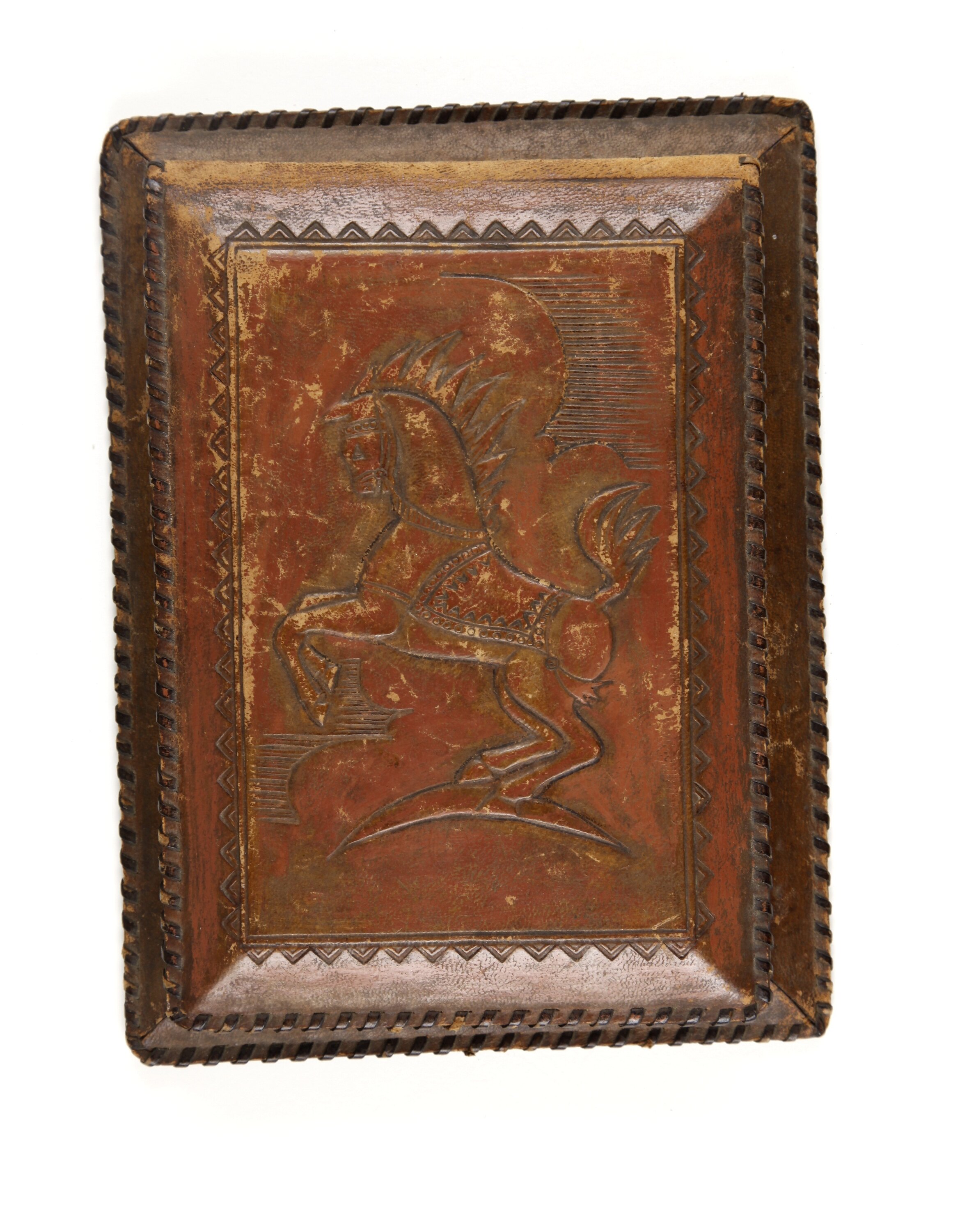 This leather notebook cover features an embossed horse picture and stamped border print on the front of the notebook. The notebook has been used, with half the pages remaining. On one of the pages is written 'I un R.Uliva(-)nn rokdarbis pec r ach H.Benzina meta Latviesu Kleinicöhg's. Then..[Crossed out] Nepardodems. [separately]...IV 32...[separately] 54'.