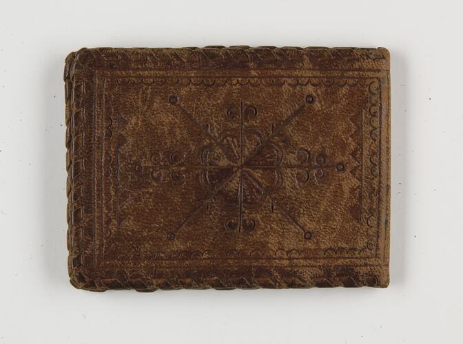 Leather sewing kit case collected by UN World War II displaced persons' camp worker Esma Banner between 1945 and 1951. It was created by a refugee in one of the displaced persons' camps in the US Zone in Germany.
