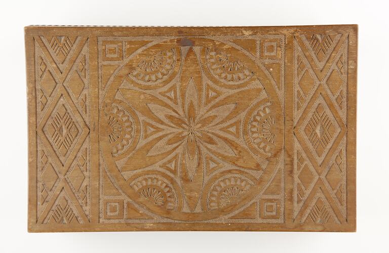 Handmade carved wooden box with carved floral geometric design on the lid, collected by UN World War II displaced persons' camp worker Esma Banner. It was created by a displaced person at Neu-Ulm Displaced Persons Camp in Germany.