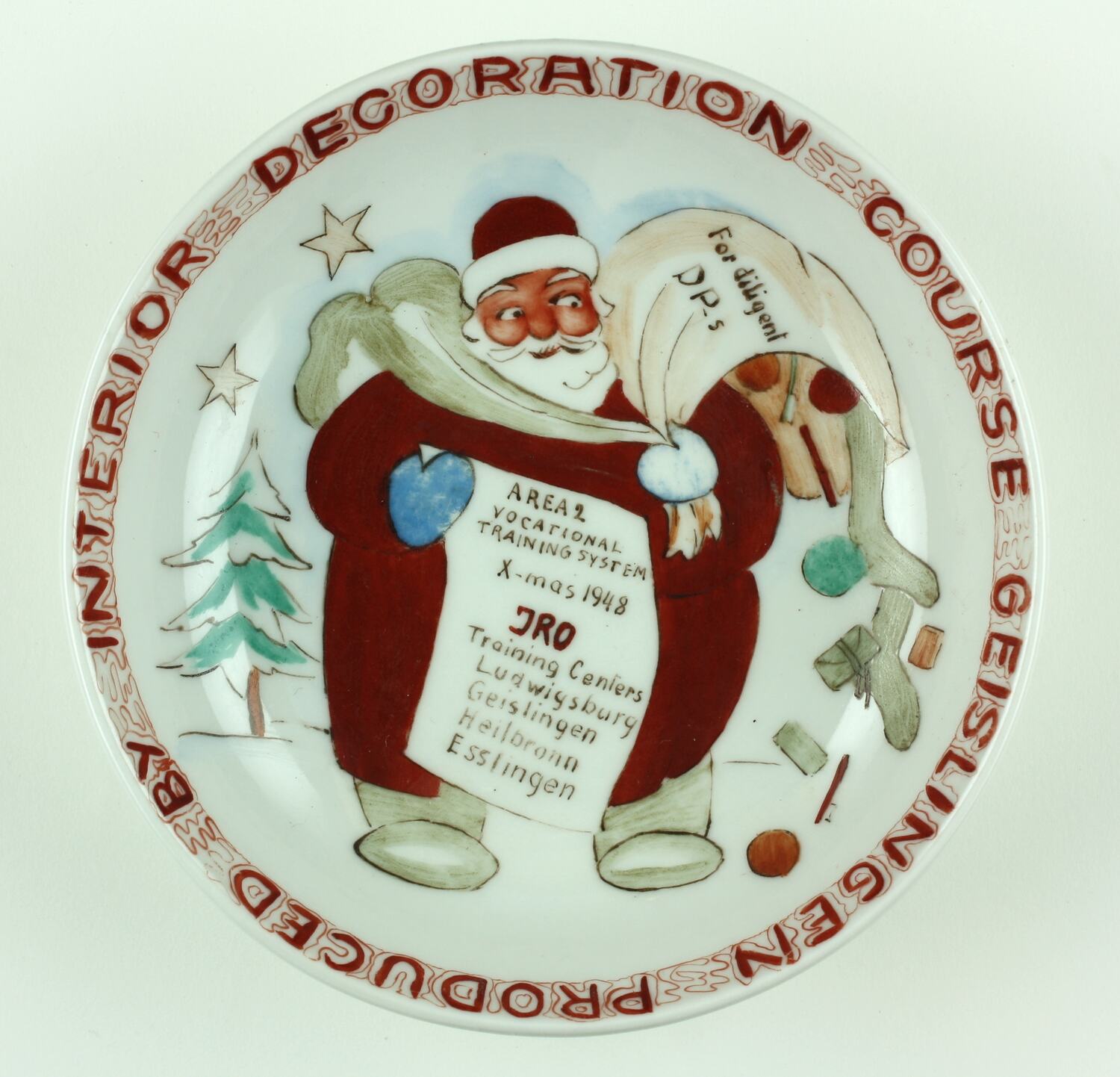This handpainted dish reads 'PRODUCED BY INTERIOR DECORATION COURSE GEISLINGEN' written in red lettering around the rim of the dish. It features a hand painted picture of Santa Clause who is carrying a sack filled with presents on which is written 'For Diligent DPs'. Santa holds a scroll that lists 'Area 2, Vocational Training System, X-Mas 1948, IRO, Training Centers, Lydwigsburg, Geislingen, Heilbronn, Esslingen'. The object appears to be a standard issue plate used at the camps, with a stamp on the back of the dish that reads 'Bauscher weiden, Germany US Zone'. The word 'Handpainted.' has been handpainted on the back of the plate in red.