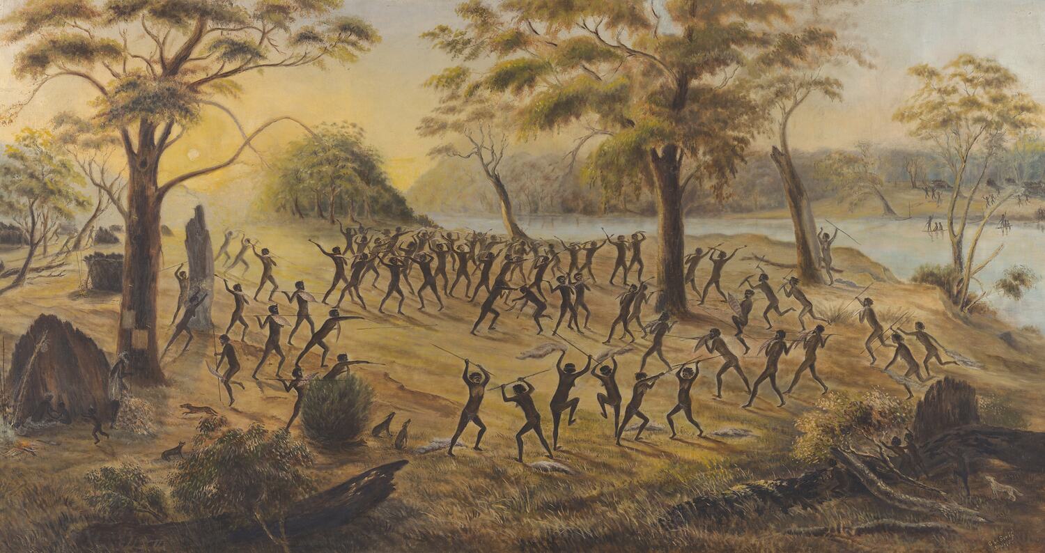 'Native Fight on the Lower Goulburn River in 1842' painted by artist Caroline Le Souëf in 1895. The painting depicts a fight between members of the Bangarang (spelt by Le Souëf as Pangarang) and the Oorilim tribes in 1842 witnessed and later described by Caroline's husband Mr. Albert A. Le Souëf. During his teens Albert spent three years at the Goulburn River protectorate station, managed by his father, where he gained lasting knowledge of Aboriginal culture and bushcraft. It was during this time that he witnessed the fight depicted in this painting.