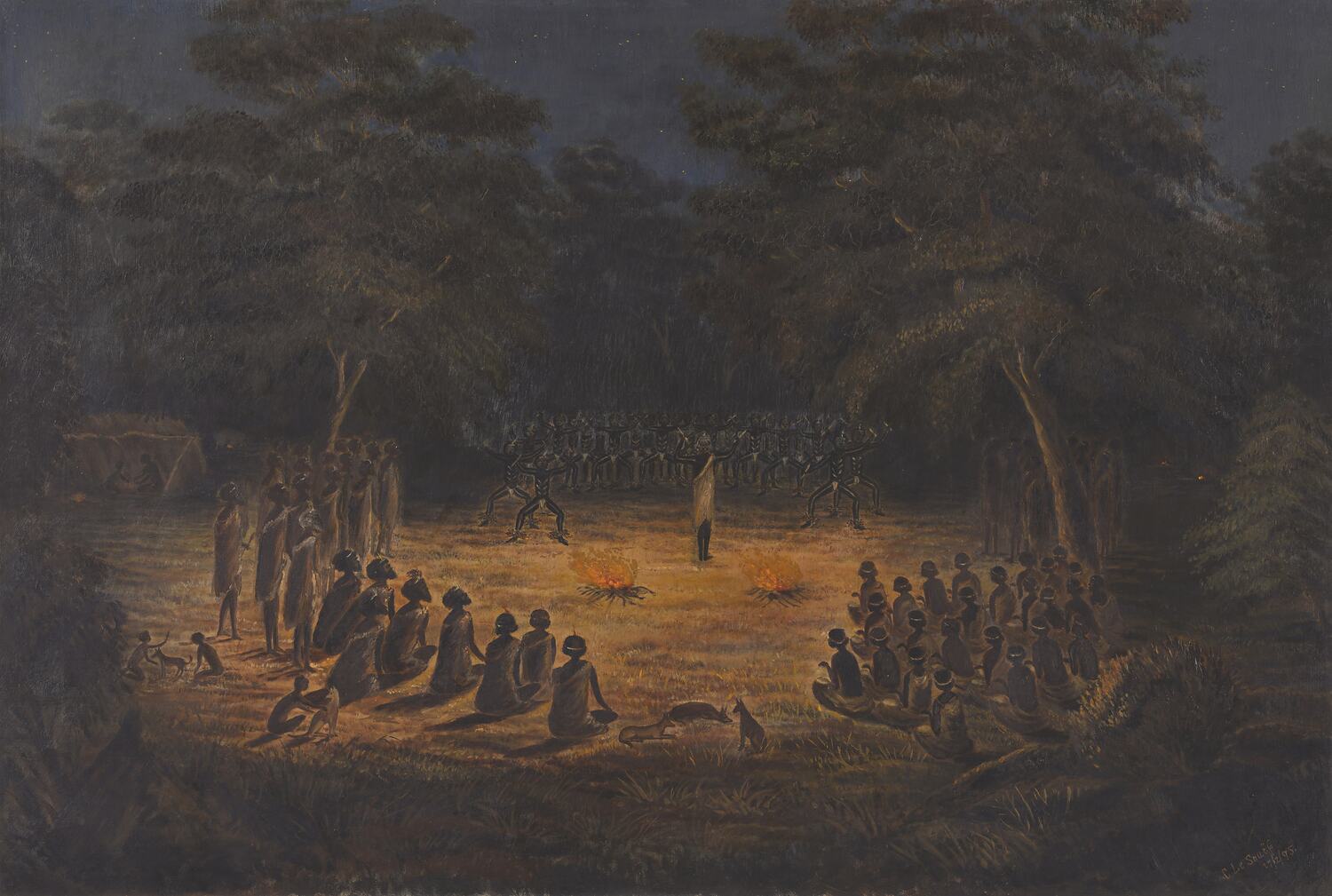 Oils on canvas, depicting a dance scene at night. Titled 'Corroboree on the Goulburn River'. Signed and dated 27/2/1895.