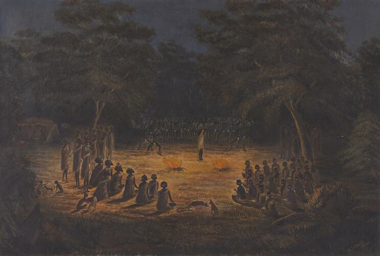The events depicted in the painting took place on the site of what is today Murchison on the Goulburn River in Victoria, with the onlookers in the painting being members of the Oorilim tribe. The painting depicts the dancers just before the final rush which Albert describes: 'the dancing now ceased, and the men rushing into a compact body, stamped with their right feet until a cloud of dust arose, when with a sudden yell, each man threw his arms above his head, and they then retired into the gloom, to commence again.'