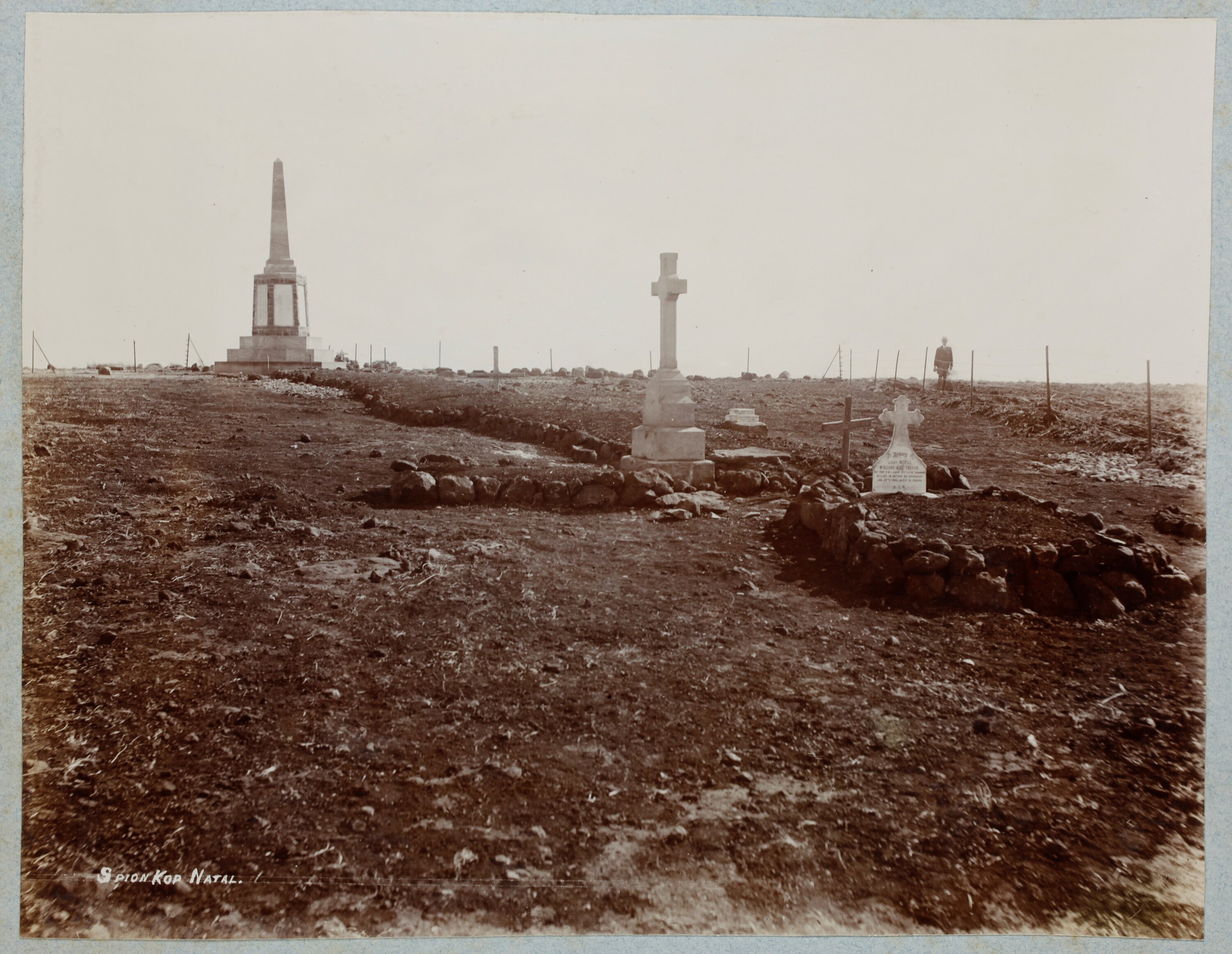 View of the British Memorial and graves at Spion Kop Natal. There is a man standing in the distance, South Africa, circa 1902.