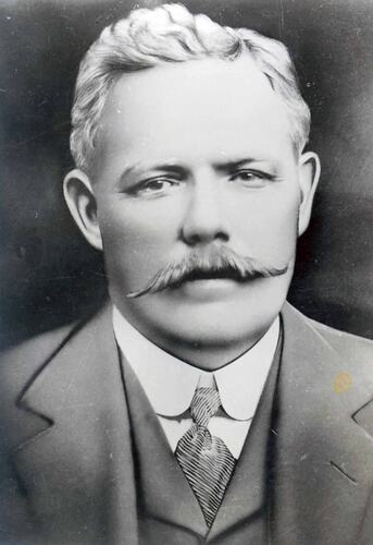 Portrait photograph of Hugh Victor McKay wearing suit and tie. He also has a moustache.