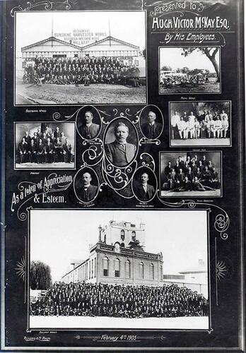 Photograph of presentation made to H. V. McKay. Consists of a compilation of photographs. Portrait of H. V. McKay is in the middle. It is surrounded by images of McKay's staff in front of his factories at Ballarat and Braybrook Junction, his senior staff, the cricket team, the foremen and the Picnic Committee.