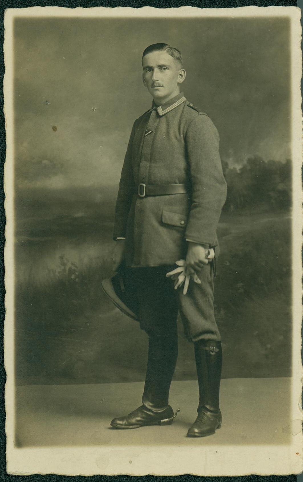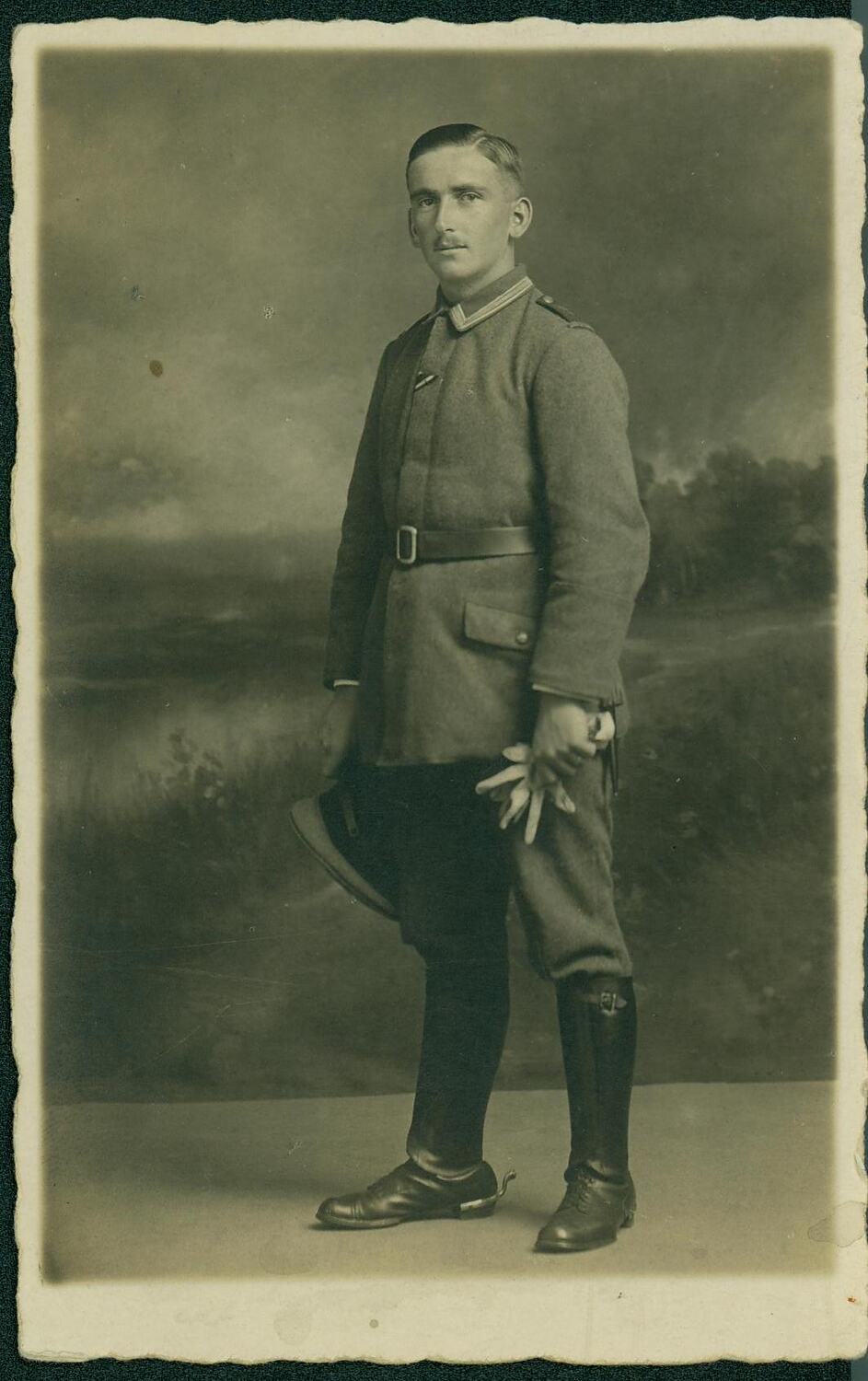 Black and white photograph postcard depicting a man in a standing pose, dressed in a military uniform of a horse cavalry unit. The photograph is taken by the photographer of the German royal family T.H. Voigt with businesses in Bad Homburg, Frankfurt Main and Cologne. Receiving the status of an associated business to the royal family was an honor, as it indicated that one's product was of high quality.