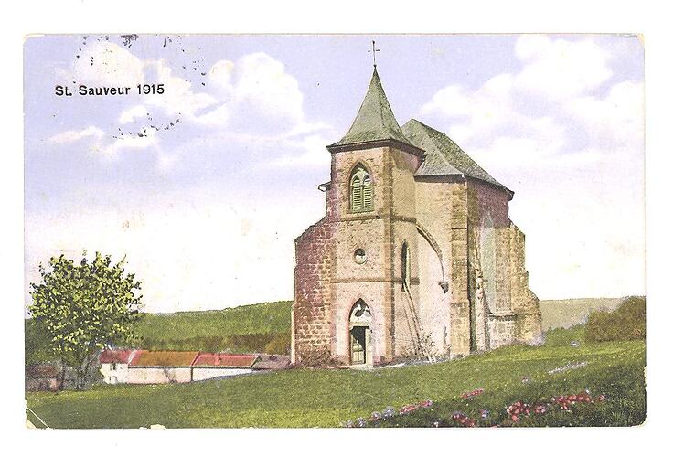 Coloured postcard that shows a chapel at a village side. The imprint St. Sauveur 1915 suggests that the chapel is in France. The card shows some wear and stains. Handwritten text in the old German handwriting style Suetterlin.