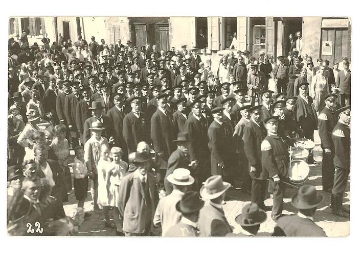 Black and white postcard depicting a parade of men in coats and hats standing in the middle of the road. In front of them is a music band. The group is surrounded by men, women and children, all facing in the same direction as if posed for the photograph. The edges show some wear.
