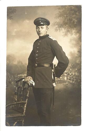 This black and white postcard captures a portrait of a German soldier in uniform. The young man stands next to a chair and is resting his right hand, which holds white gloves, on the chair. His left hand is behind his back giving view to a dagger that hangs from his belt. The regimental shoulder strap on his jacket is numbered '20'. The background is a landscape on canvas. It looks like the picture was taken in a photo studio. The postcard shows some wear.