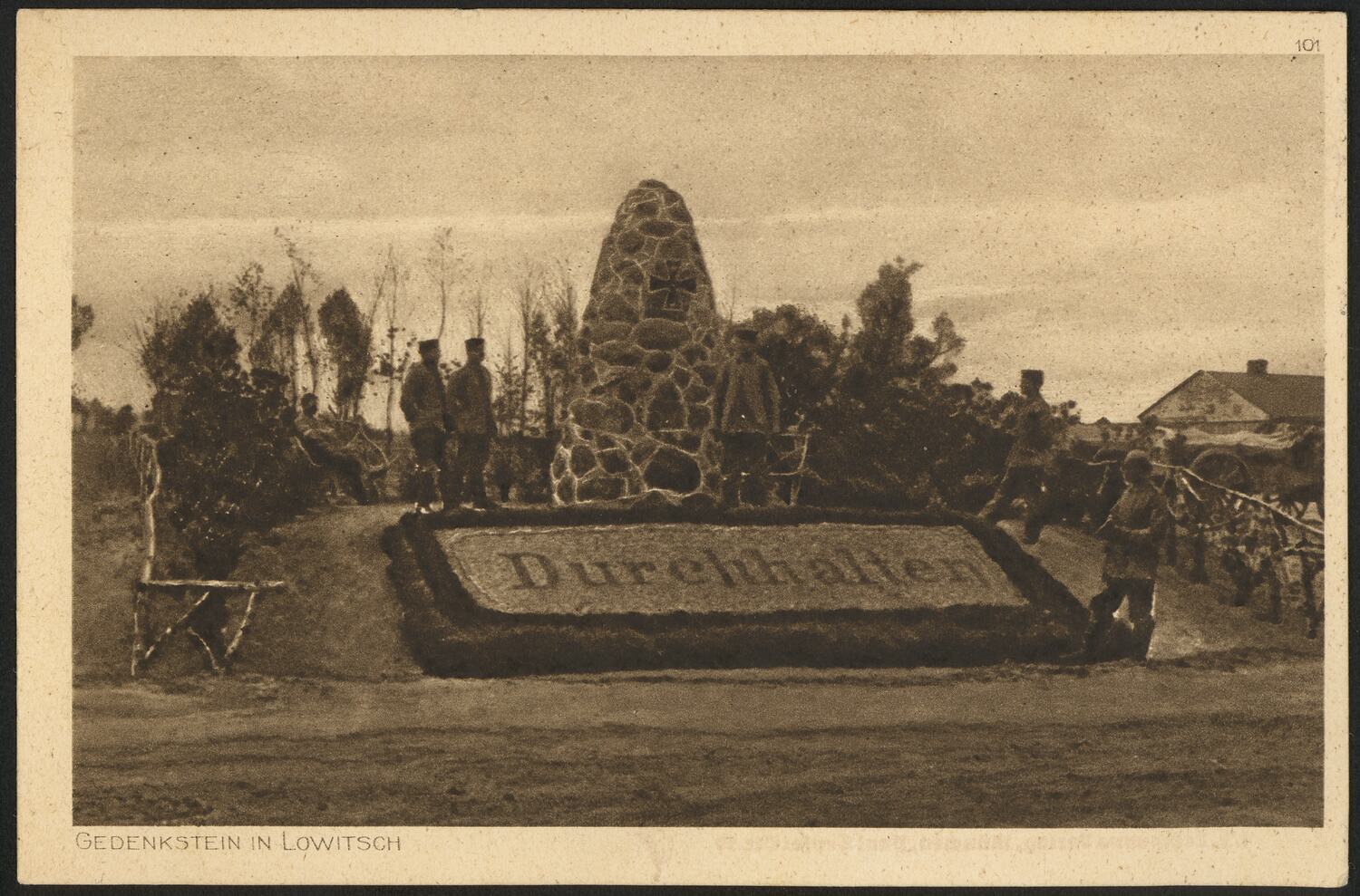 Postcard in German, written on 12 January 1917, during World War I. The postcard is inscribed 'Gedenkstein in Lowitsch'. During World War I the Polish town Lowicz (Lowitsch) was occupied by Germany. The memorial stone depicted is inscribed 'Durchhalten' ('Hang on') - directed at German soldiers and/or the German public. The postcard is numbered '101' and may be part of a series.