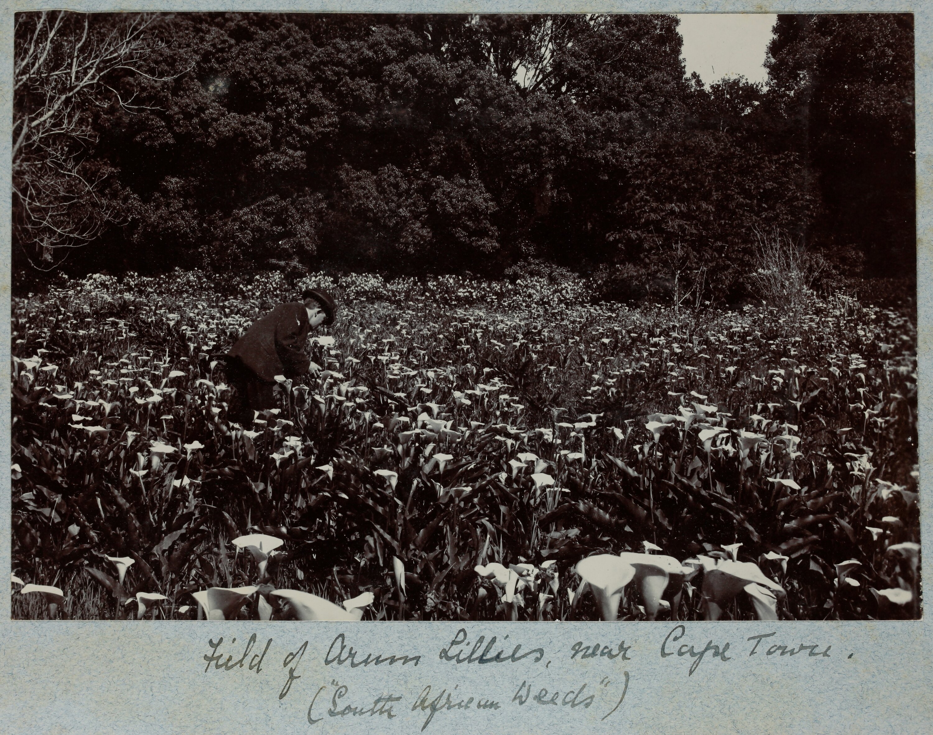 Hand written in black ink on the album page; 'Field of Arum Lillies, near Cape Town. / ("South African Weeds")'